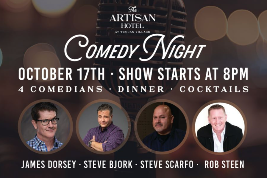 TELL ME MOREGet ready for a night of laughter, delicious bites, and great company at The Artisan Hotel. Dinner begins at 6:30 PM, followed by the show at 8:00 PM, featuring four stand-up acts sure to keep you entertained.
